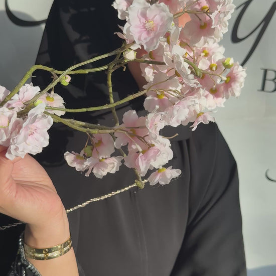 Deze set bestaat uit een abaya, een bijpassende onderjurk en een hijab voor een complete look.