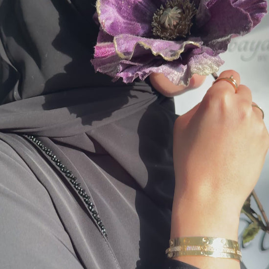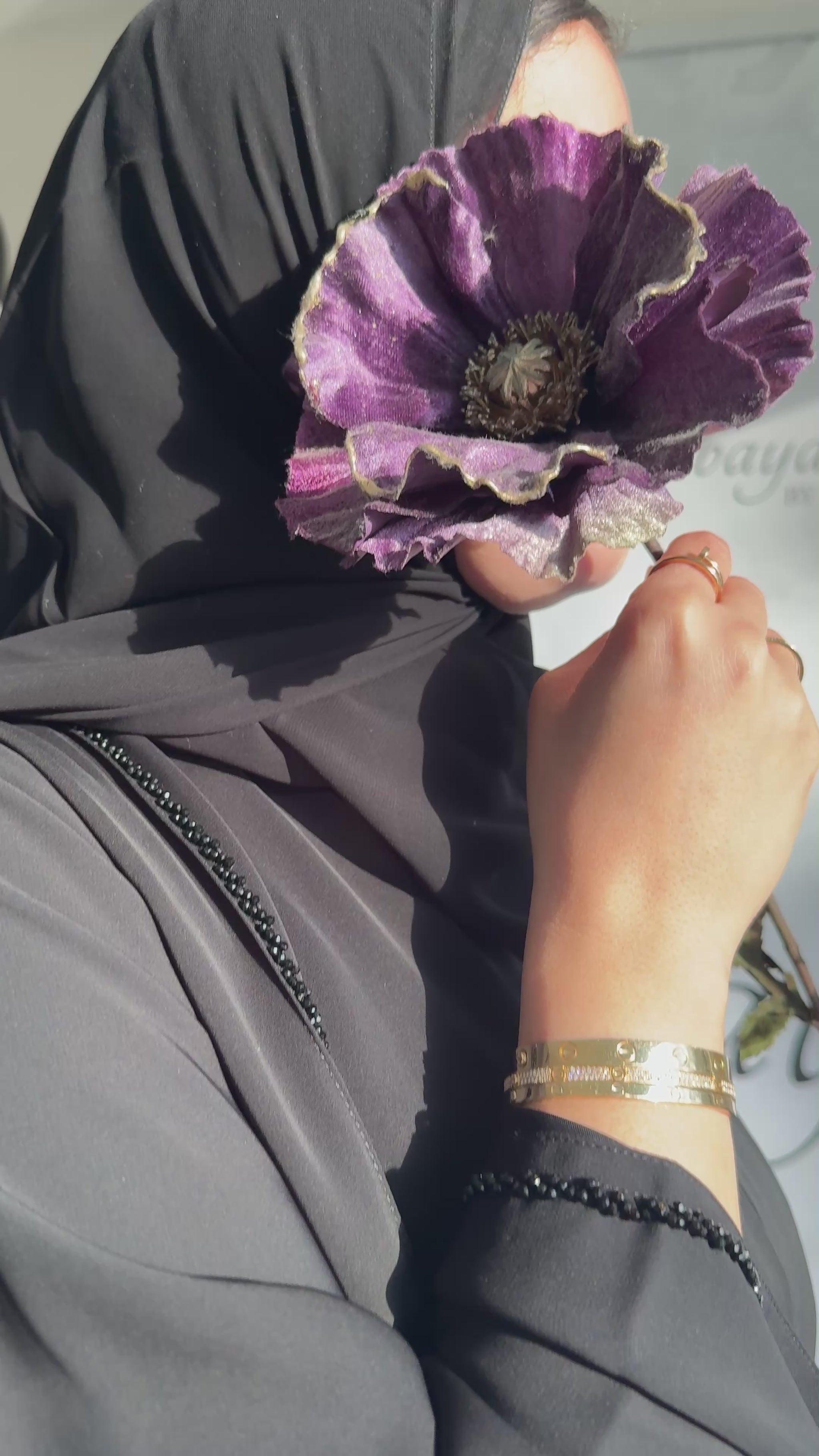 Deze set bestaat uit een abaya, een bijpassende onderjurk en een hijab voor een complete look.