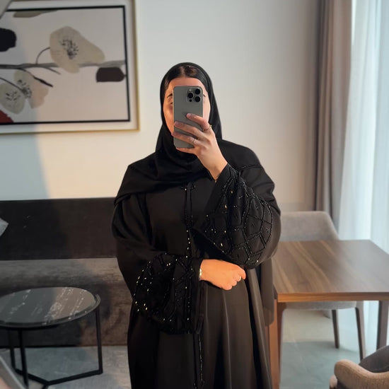 Deze set bestaat uit een abaya, een bijpassende onderjurk en een hijab voor een complete look.